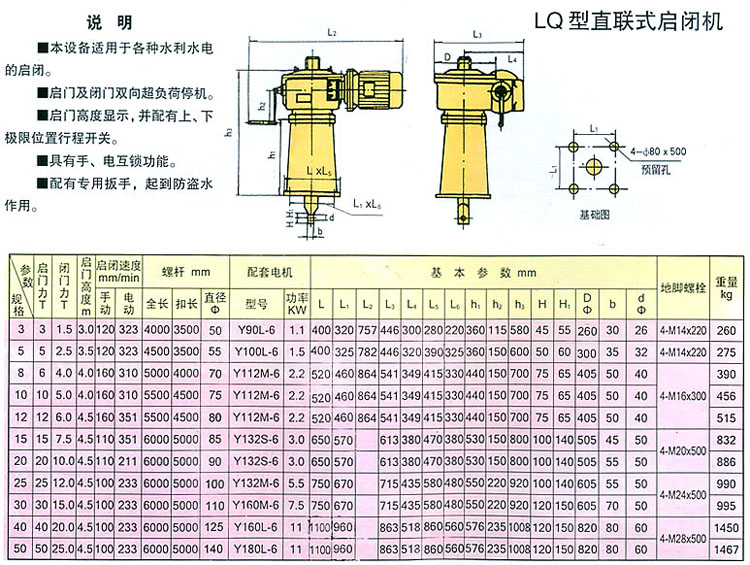 我廠(chǎng)主要產(chǎn)品有:LQ型0.3T-50T單、雙吊點(diǎn)啟閉機(jī),具有手電兩用,手推,手扳,手搖帶鎖,雙吊螺桿式啟閉機(jī)及全封閉等形式。卷?yè)P(yáng)機(jī)有QPQ,QPK,QHQ,5T-125T固定,移動(dòng),單吊點(diǎn)和雙吊點(diǎn);鑄鐵閘門(mén)有PZ,ZMQY,ZMQF,PGZ等多種型號(hào)分別為:鑲銅閘門(mén),拱形閘門(mén),平板平面閘門(mén),組裝閘門(mén),雙面止水閘門(mén),鑄鐵及鋼板閘門(mén)及鋼結(jié)構(gòu)平面滑動(dòng)定輪閘門(mén),規(guī)格型號(hào)分別為0.2M*0.2M--8M*10M等,同時(shí)生產(chǎn)水利水電工程用各種規(guī)格型號(hào)橡膠止水,清污機(jī),并可根據(jù)用戶(hù)的特殊需求生產(chǎn)各種異型閘門(mén)。